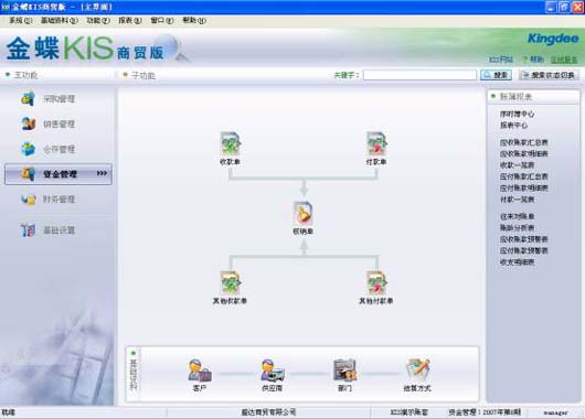通过往来对账单和收付款一览表,做到资金管理一目了然,提供预警管理,帮助企业随时监控到期的收付款业务,有效规避资金回收的风险,支持应收冲应付、应付转应付、应收转应收等三角债资金结算业务处理, 通过收款单、付款单、其他收款单、其他付款单、核销单五张单据,处理同供应商、客户的主营业务以及非主营业务的往来结算,综合反映企业全盘收支情况,通过收支明细表,可以了解一段时期内企业所有收支业务的资金信息情况。