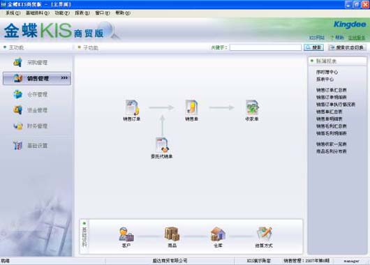 对订货、出库、退货以及委托代销等关键业务的全面跟踪,也满足预收定金、代垫运费、发货收款等资金业务,实现商品销售和资金的紧密连接,通过对客户资料、信用额度、结算期限的有效管控,使企业灵活快速应对市场变化,减少呆账,规避销售风险,支持多级销售价格查询、历史销售价格查询、销售限价等销售价格处理方式,方便快速报价帮助您做出合理销售决策,预置大量丰富的销售报表,如销售收款一览表、销售毛利明细表、商品毛利分布表、销售排行榜等全方位统计分析报表, 实时掌握整体销售及盈利情况。