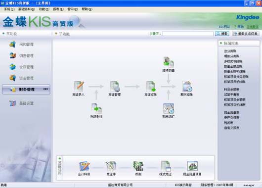 教练式财务教您如何完成日常账务处理、期末结账等,就算不懂财务也能应对自如,系统提供凭证制作向导,业务单据可选择是否生成记账凭证,可实现数据严谨或粗放性共享,支持外币业务、数量金额核算、项目核算,预置丰富的标准财务账表、现金流量表及自定义报表,全面支持新会计准则、企业会计制度、小企业会计制度。