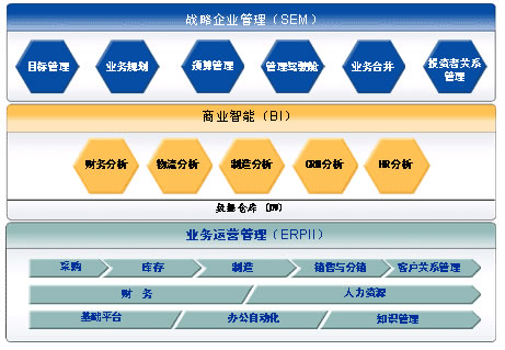 基于企业绩效管理(BPM)的思想,金蝶K/3 V10战略企业管理信息化解决方案可分为三层: 第一层为业务运营管理层——包含财务管理、物流、制造、客户关系管理、人力资源、办公自动化等ERPII组件,提供企业日常业务的处理功能。 第二层为商业智能层——提供全面的商业分析与优化功能,包括财务分析、物流分析、制造分析、人力资源分析以及客户关系管理分析等。 第三层为战略企业管理层——通过提供企业战略管理和战略规划的各种工具与方法,来实现战略目标管理、业务规划、预算管理、管理监控、业务合并、投资者关系管理等功能。