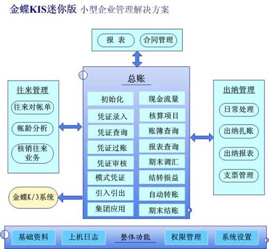 金蝶KIS迷你版高度集成了小型企事业单位要使用的账务处理、报表、出纳管理、往来管理和合同管理等功能模块,在软件的集成度、会计管理功能、安全性、通用性、操作的方便性、用户界面、与其它常见应用软件的接口等方面均有重大突破。