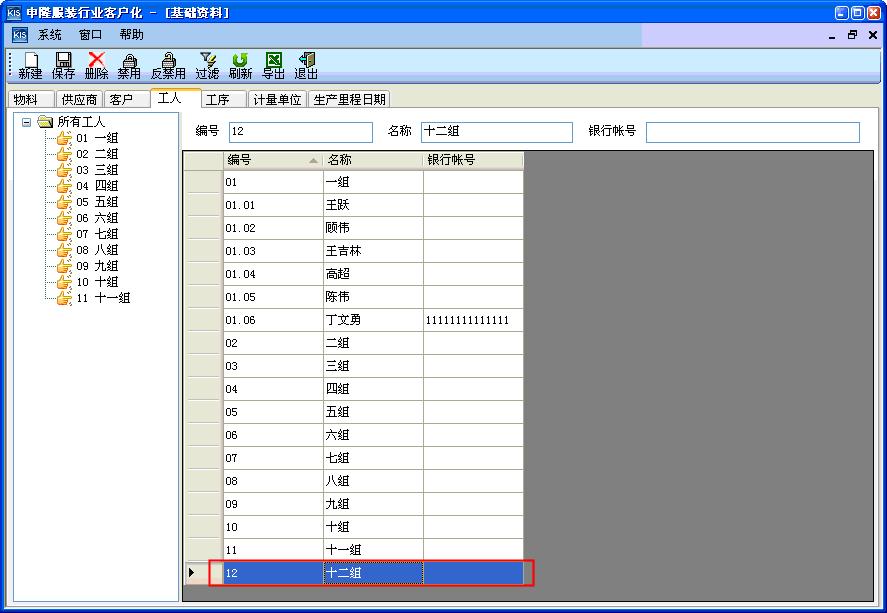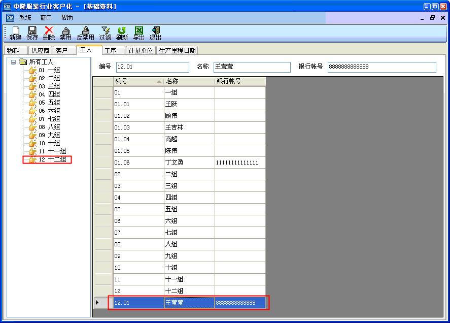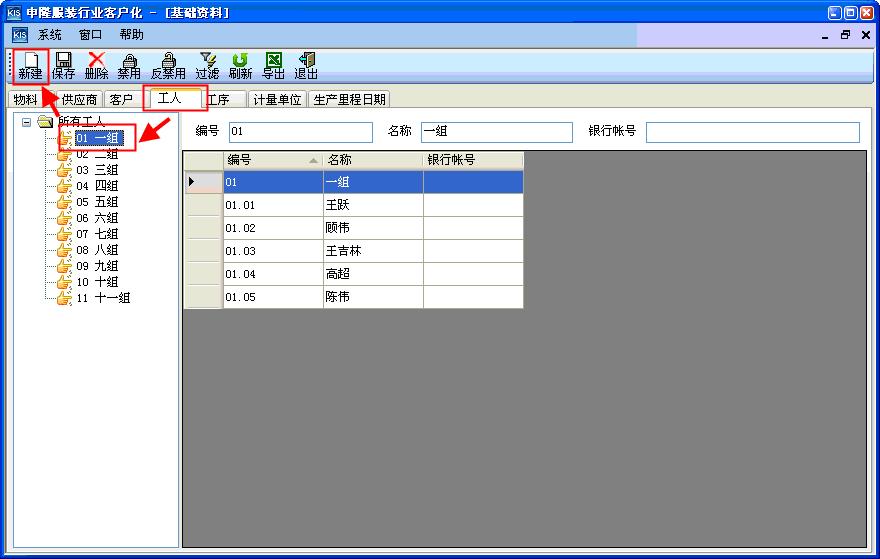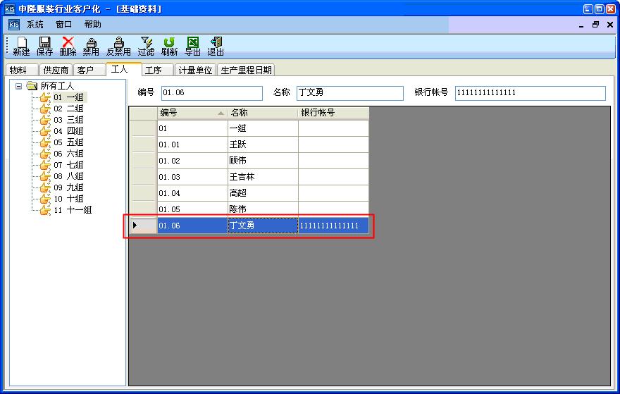 先选择“工人”模块,再选中所需更改的类别,然后点“新建”按钮,这时“编号”、“名称”、“银行账号”会置空,然后输入子类别“编号”、“名称”、“银行账号”内容,然后点“保存”按钮,结果如下图所示: