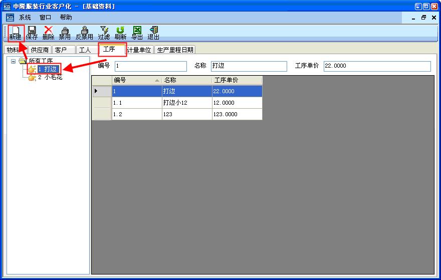 若需要在左侧树中新增工人类别,先点“新建”工具栏按钮,先在“编号”、“名称”、“工序单价”输入新增内容(注意不要和现有类别同名,若同名系统会给出提示),然后点“保存”
