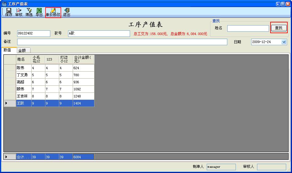 点“单价修改”工具按钮,可实现对本张单据中工序单价的修改。“查找”功能,可实现某个工人明细的快速定位。