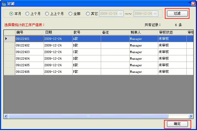 按上图所示步骤,点“工序产值统计报表2”弹出过滤窗口,如下图所示: